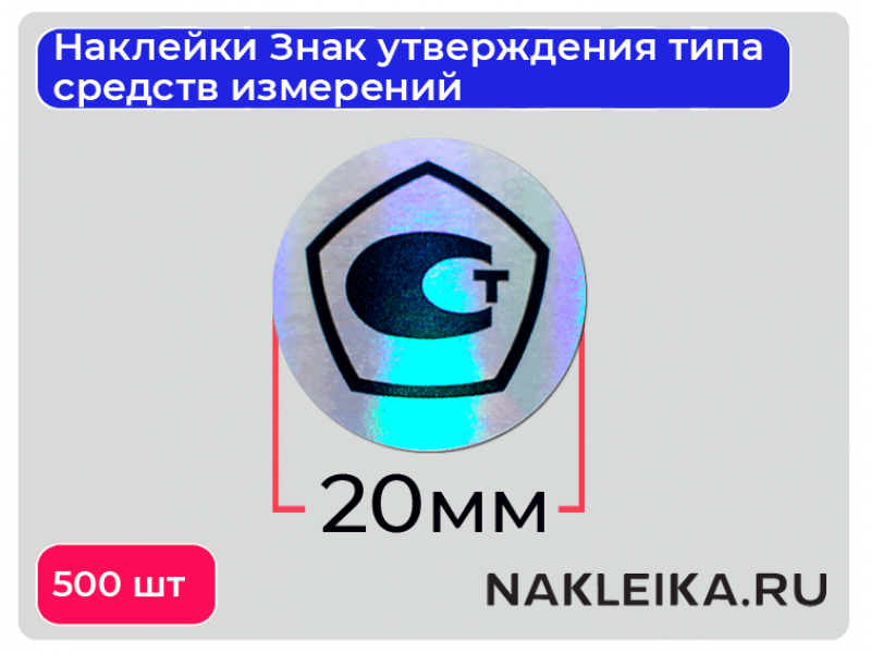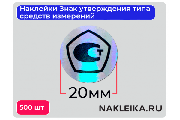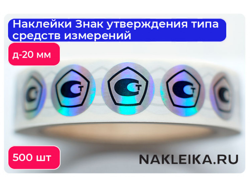Наклейки Знак утверждения типа средств измерений (СИ) диаметром 20 мм на голографической плёнке — официальный элемент маркировки, подтверждающий, что средство измерений прошло процедуру утверждения типа в соответствии с законодательством. В наличии на складе — можно заказать оптом и получить в день заявки!